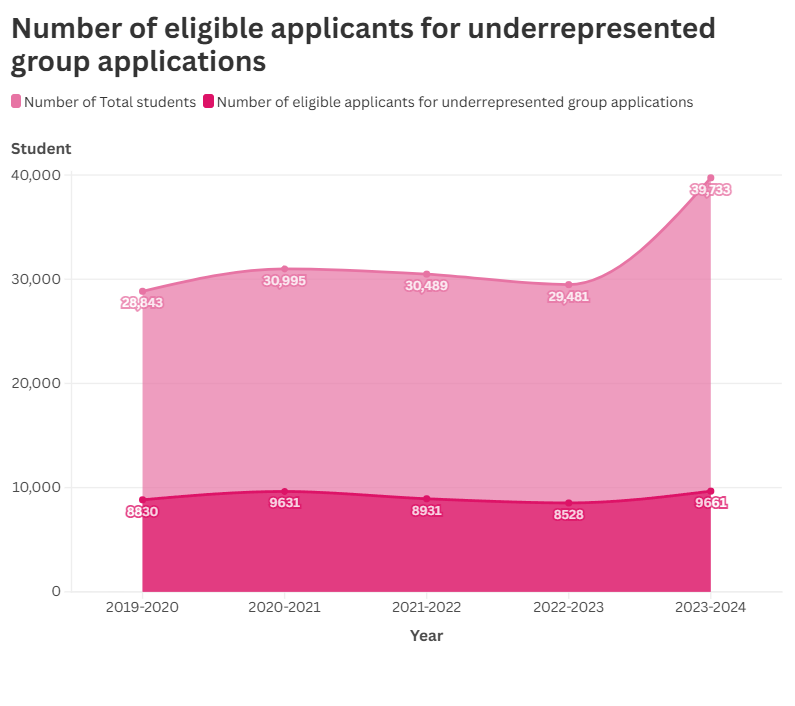 This stacked area chart illustrates the number of eligible applicants for underrepresented group applications. The overall application numbers show a clear upward trend, reaching a peak of 39,733. The eligible applicants from the underrepresented group (darker segment) rose from an initial value of 8,830 to a final value of 9,661. This constitutes a net increase of 131 applicants. The group previously dipped to a low of 8,528, resulting in a 13.3% increase from that trough to the final point