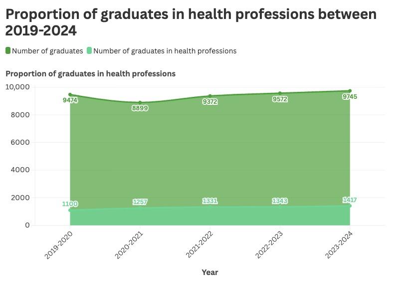 This graph illustrates the proportion of graduates in health professions between 2019 and 2024. The number of graduates in health-related fields increased from 1,100 in 2019-2020 to 1,417 in 2023-2024, reflecting a growth of approximately 29%. Although total graduates fluctuated slightly, the upward trend in health professions suggests sustained institutional investment in medical and health sciences education, potentially influenced by heightened demand for healthcare professionals following the COVID-19 pandemic.