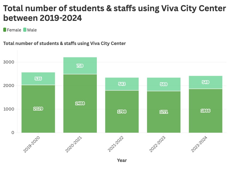 The stacked bar chart presents the total number of students and staff using the Viva City Center from 2019 to 2024. Usage rose from 2,564 in 2019-2020 to a peak of 3,207 in 2020-2021, marking a 25% increase, before gradually declining to 2,415 in 2023-2024. The initial growth likely reflects increased engagement in wellness and activity programs, while the subsequent decline may be attributed to pandemic restrictions and shifts toward remote or hybrid learning models.